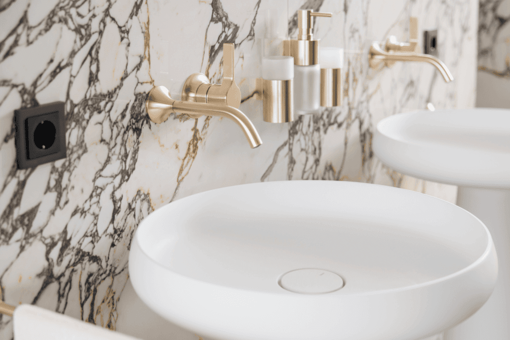 Die Waschtischlösungen sind bewusst reduziert gehalten, mit freistehenden Becken und hochwertigen Armaturen, die die Exklusivität des Gesamtkonzepts unterstreichen.