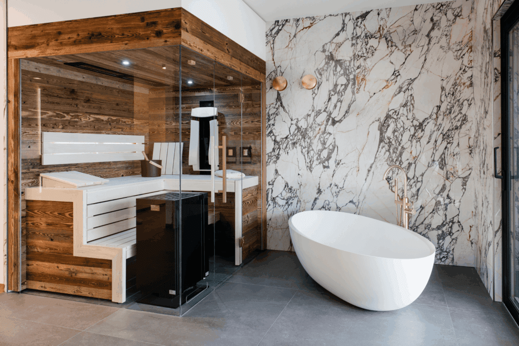 Eine freistehende Badewanne als skulpturales Element, kombiniert mit einer integrierten Sauna aus warmem Holz, schafft eine außergewöhnliche Verbindung aus Design, Komfort und Entspannung. Die Materialkombination aus Naturstein, Holz und Glas sorgt für ein ausgewogenes Zusammenspiel von Eleganz und Behaglichkeit.