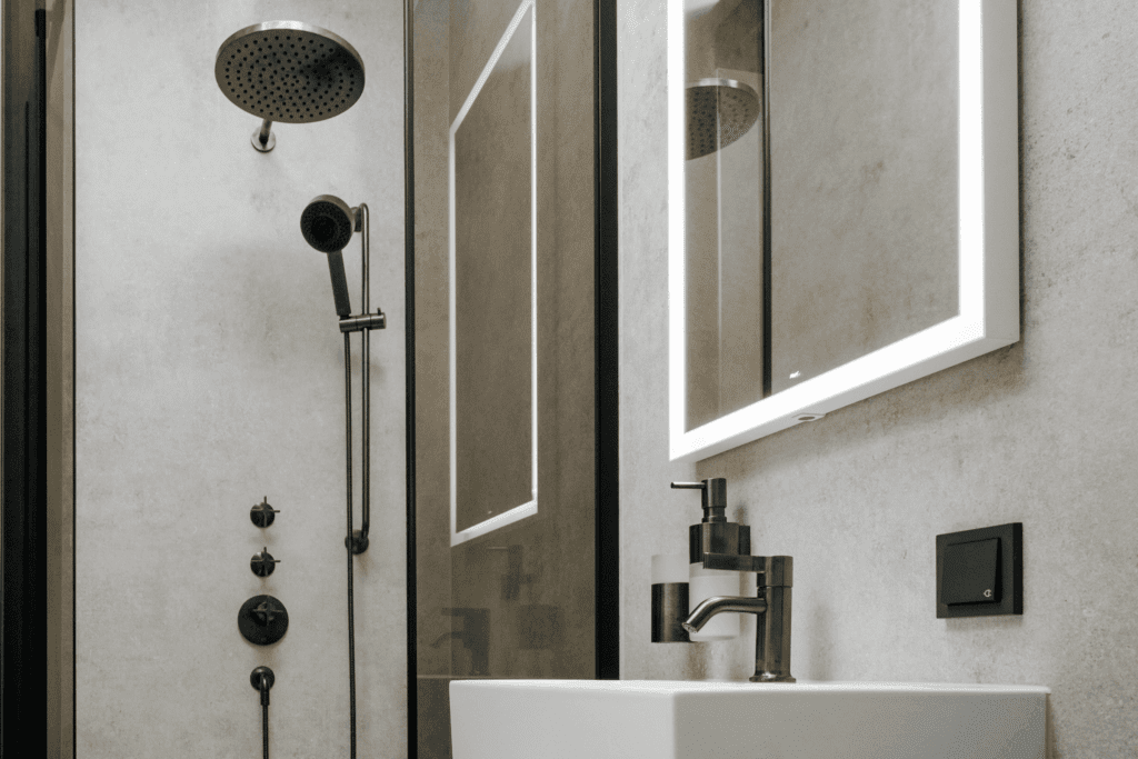 Dieses Badezimmer zeigt, wie zeitgenössisches Design und handwerkliche Präzision zu einem stimmigen Gesamtbild verschmelzen.